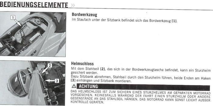 seit drei Wochen habe ich nun meine 2005'er Adventure S. Das Bordwerkzeug habe ich mir natürlich angesehen und den Flaschenöffner sofort gefunden Der Rest des Werkzeuges war auch soweit selbsterklärend.