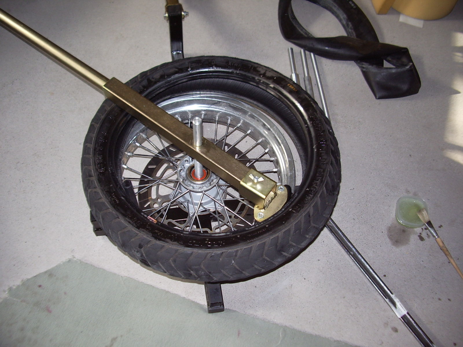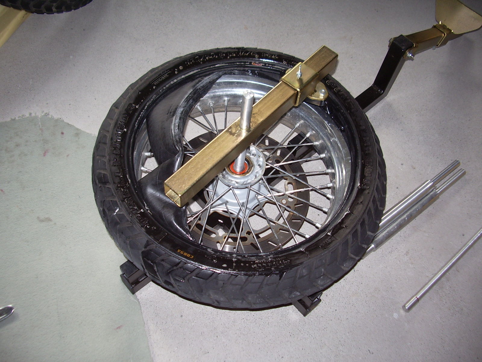 Montage - Bilder sind noch mit der alten Version gemacht worden (silberne SM Felge), bei der überarbeiteten Version lässt sich Reifen mit installierter Achse abdrücken (was ich deutlich kommoder finde)