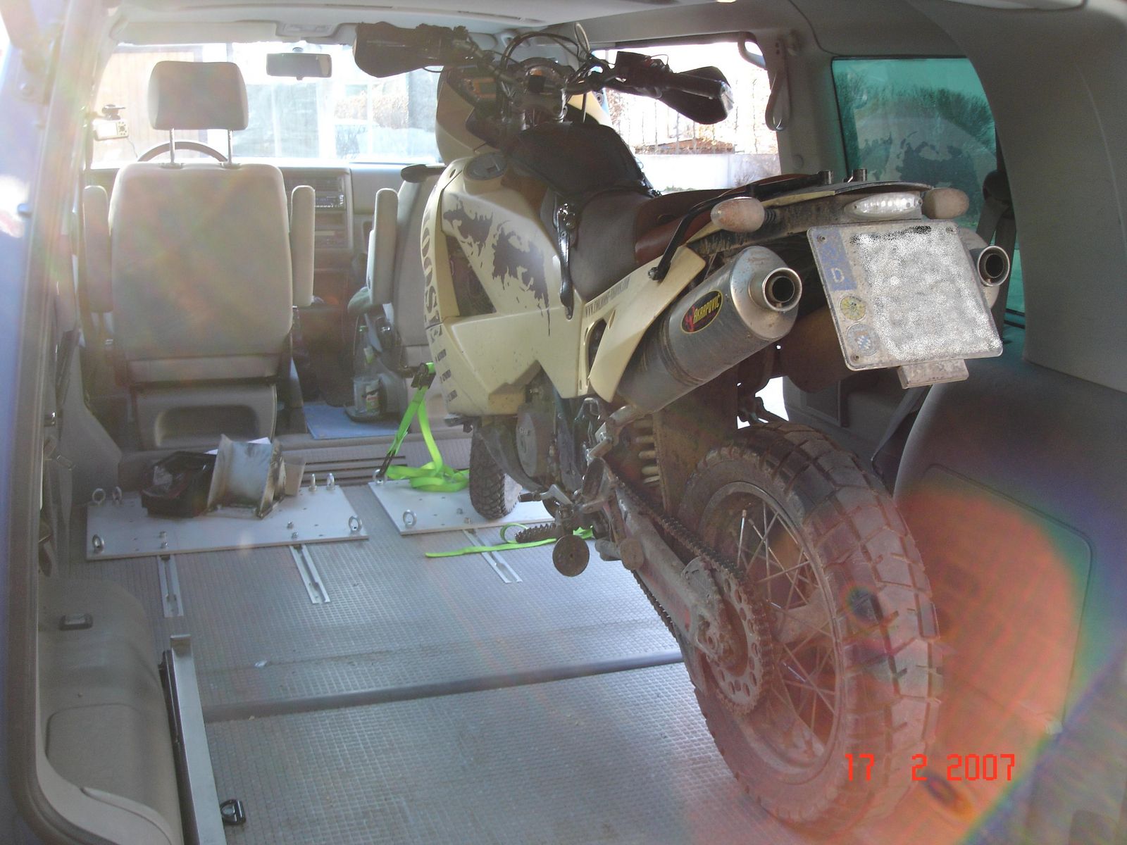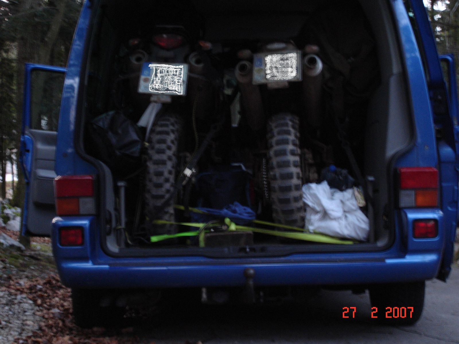 Ich hab'n T4 Kastenwagen mit Hochdach (Womo-Ausbau) an den ich einen Motorradtträger von Cate montiert hab. Ich bin gerade dabei, die Schiene noch etwas zu verlängern, da ich bisher nur die LC4 damit transportiert hab. Die LC8 hat einen etwas längeren Radstand, deshalb der Umbau. Ich hab den Cate jetzt schon seit vier Jahren und find das Ding recht praktisch. Man kann ihn, bis auf die Ausleger unten, komplett demontieren und den Wagen dann bei Bedarf ganz ohne fahren.