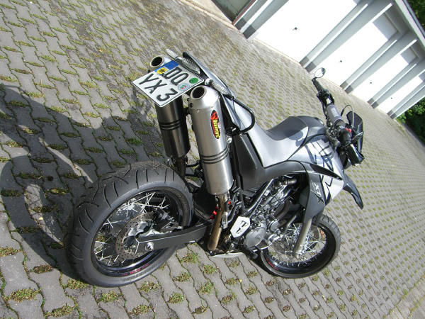 hi, bin der carsten aus dortmund...habe mir vor 2 jahren die xt660x gekauft und mußte feststellen das sie leider nicht genug leistung für das gewicht hatte....dann habe ich mich hier mal ein wenig angefixt mit der droge 950sm...habe die xt an die sonne getan und blind (ohne probefahrt und ohne einmal drauf gesessen zu haben) ne 06er bestellt...dachte mir sind ja ca die gleichen angaben wie bei meiner alten nur halt doppellte leistun...gemacht getan...habe sie im januar (vor 5 tagen) abgeholt und auseinandergebaut...akra drann, 16er ritzel, heckumbau, luftfilter gefenstert, griffschalen drann...bei den blinkern weiß ich noch nicht so genau, werden wohl die kellermann rhombos...habe zwar schon drauf gesessen aber immernoch keine runde gedreht....bin schon richtig heiß.... ;-)