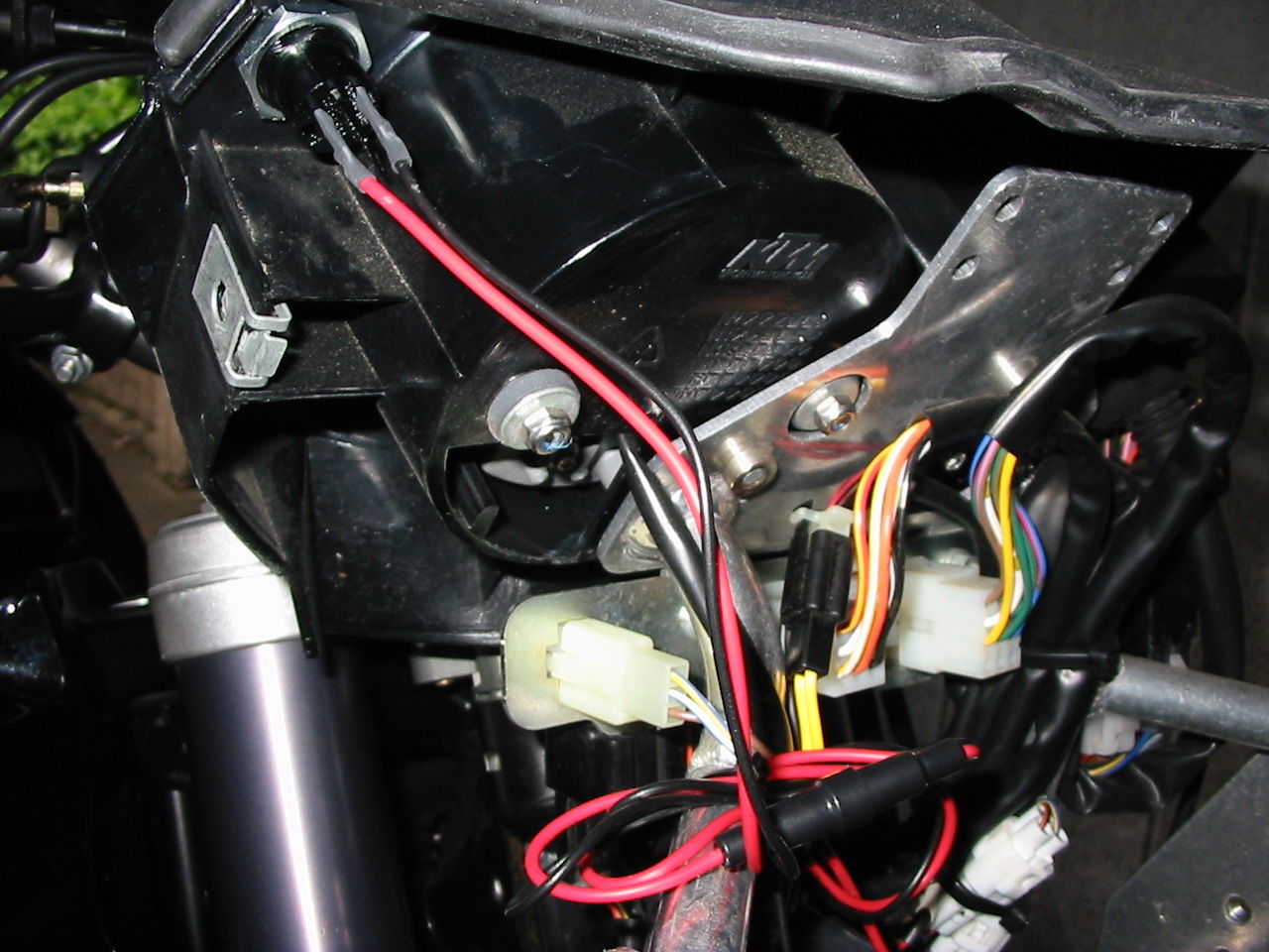 Da die große Dose ein Loch von 28 mm braucht, wird´s vorne schon recht eng. Hab deshalb das Ding rechts vom Zündschloß hingebaut und bin mit dem Kabel wie bereits bestehend am Lenkkopf vorbei.Kein Herumbohren mit dicken Bohrern an Sichtflächen notwendig. Nur ein Adapterstück muß gefertigt werden.