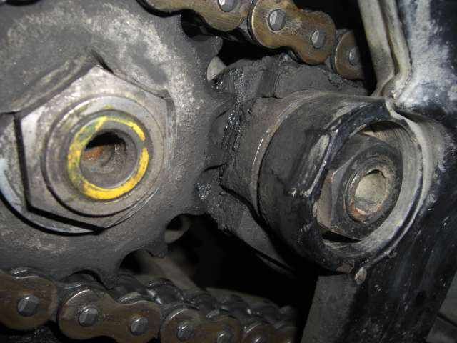 Auf der Schwinge sitzt ein Kettenschleifer aus Plasik, der verhindert, dass die Kette die Schwinge durchraspelt.