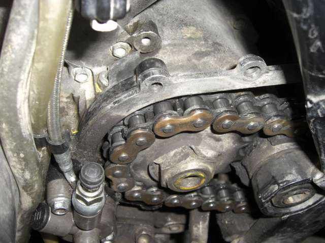 Vorne am Ritzel ist ein Stahl-Streifen, mittig über der Kette angebracht, der eine evtl. gerissene Kette sauber nach unten umleiten soll, damit sie nicht das Motorgehäuse zertrümmert. Daran ist auch die Plastik-Abdeckung des Ritzels angeschraubt. Diese Abdeckung verhindert bloß, dass abgeschleudertes Kettenfett den Motor verunreinigt, oder hindert eingedrungenes Erdreich am rausfallen.