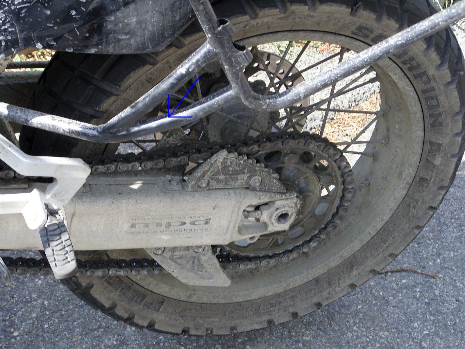 Der (Ketten-)Schleifschutz ist vorne am Schwingenlager. Das schwarze Kunststoffding, dass quasi von oben um das Lager herum nach unten geht... und das kann man wirklich nicht abreissen... höchstens irgendwann durchschleifen.