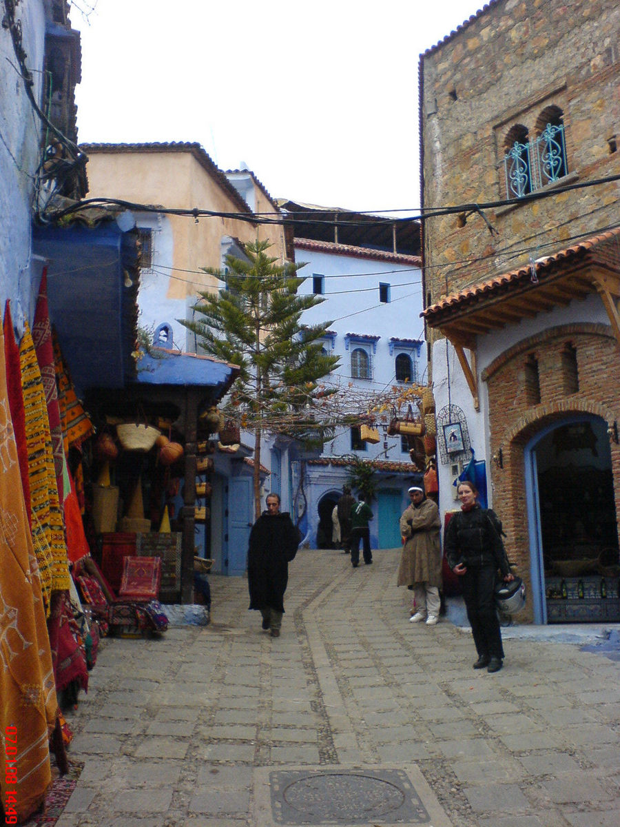 Der Ort wieder katastrophal, plötzlich stehst du mitten im Schlamm, dann der Wochenmarkt direkt auf der Strasse viele Leute, Obst, Gemüse, Altes und Gebrauchtes. Häuser, die beim dritten mal hingucken im letzten Jahrhundert vielleicht mal schön gewesen sein könnten. An einer Kreuzung wird ein uralter Bus repariert, da liegen Leute drunter und schweissen ! bloß nicht über die Beine Fahren. Weltkulturerbe ??? Da ein Schild "Medina" --> hin, die Brumme an einen Lichtmast gefesselt. Nun eine Welt wie im Märchen. Ganz kleine verwinkelte Gassen, alles in verschiedenen blautönen bemalt, unbeschreiblich schön. Kleine Lächdchen, Handwerk, orientalische Gerüche, Stände leckere Naschereien, Gewürze, eine Kasbah. Hier durften früher Nichtmuslime gar nicht rein, jetzt ein kleinwenig an Tourismus angepasst.