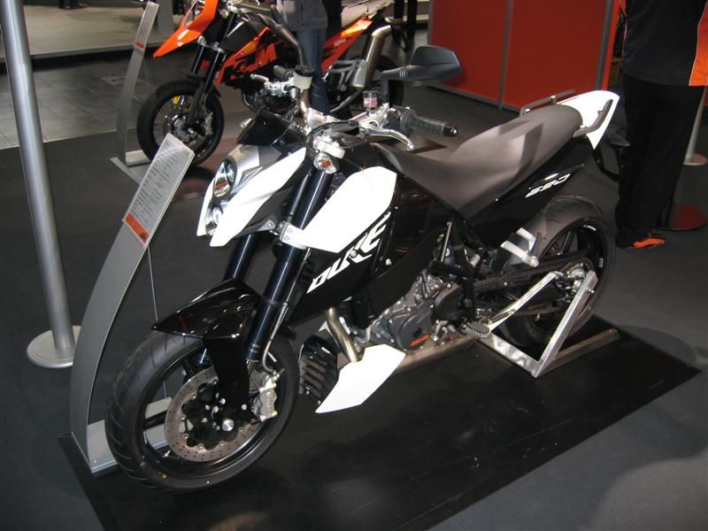 Ah,da KTM-Stand.Neue 690 Enduro,sieht in natura klasse aus.Draufhocken, paßt,super schmal kannst rutschen bis auf den Lenker,Sitzbank schmal aber gut gepolstert,aufstehen paßt auch,super Ergonomie.Neue Duke auch nicht übel,RC8 heißes Eisen, nur Tank und Heckteil wirken irgendwie billig,naja vielleicht noch Vorserie.