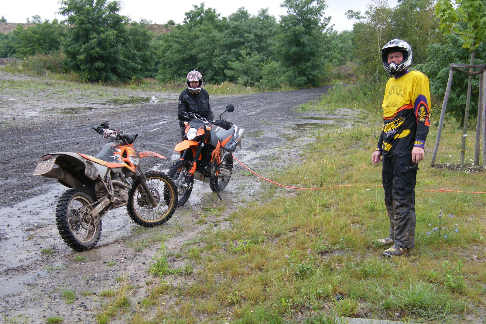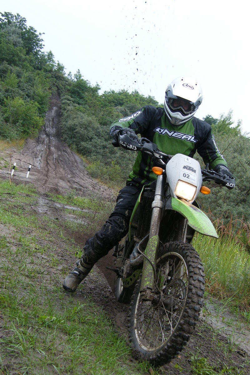 Folgende Erfahrung möchte ich noch weitergeben: Es macht sich gut, auf einer Endurostrecke sich einen etwa gleichstarken Partner (vom Fahrvermögen) zu suchen und gemeinsam seine Runden zu drehen und sich in der Reihenfolge abzuwechseln, durchs Gucken beim hinterherfahren kann man auch viel lernen. Es bringt nichts, Besseren hinterherzujagen und sich zu gefährden und warten zu müssen nervt auch.
