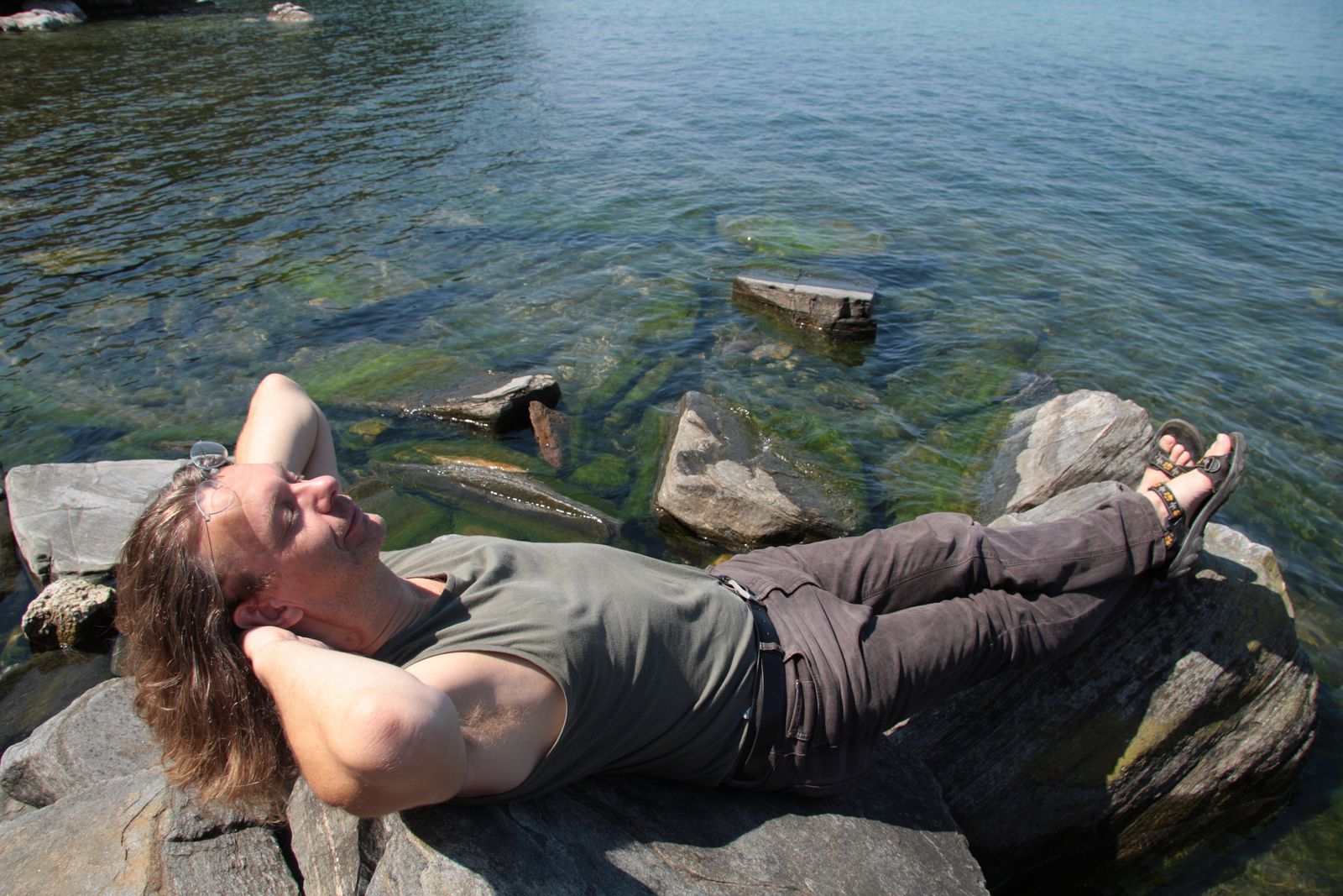 Wir akklimatisieren uns, machen einen großen Spaziergang, unterhalten uns viel. Der Baikalsee ist noch zu kalt zum Baden: 10°C. Ich versuche es kurz, aber brrr, schon bei den Oberschenkeln gebe ich auf.