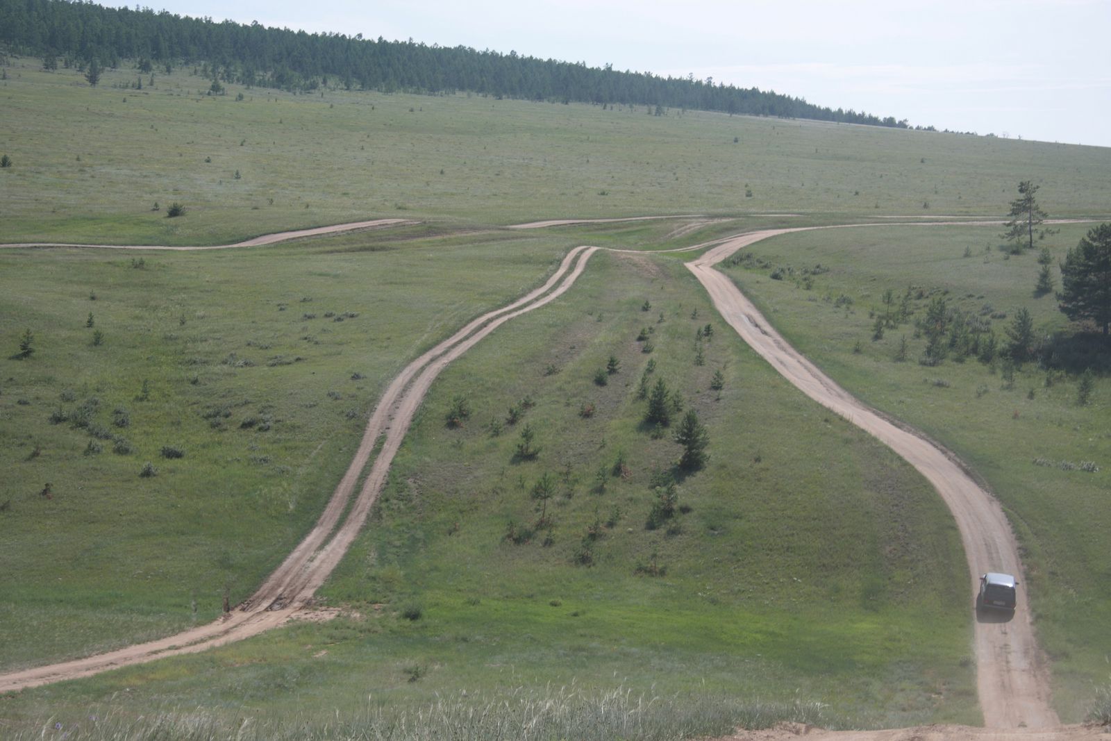 Ein Taxifahrer fängt uns gleich am Flughafen ab, und da er uns zu kleinem Preis zum Busbahnhof bringen will, willigen wir ein. Heute fährt kein Bus mehr nach Olkhon, und am Hafen stellen wir fest, das nächste Boot fährt erst Sonntag. Er bietet an, uns die 300km nach Olkhon zu fahren. Es ist anzunehmen, er kannte die Fahrpläne und hat uns als cleverer Geschäftsmann nach und nach selbst zu den sinnvollen Schlüssen kommen lassen. Nach der Moskauer Tortur gestern hätte ich dazu auch noch bei wesentlich höherem Preis eingewilligt, aber sein Preis war aus unserer Sicht nach kurzen Verhandlungen ok. So bekamen wir eine von Erläuterungen begleitete Fahrt durch die sibirische Weite, einen Imbiß an der Straße und die angenehme Überraschung, daß sibirische Taxifahrer nicht trinken. Die Landschaft ist weiträumig, leicht wellig, saftige Wiesen und lichte Wälder beherrschen die Szenerie, gelegentlich ein Dorf. Landwirtschaft (oder zumindest intensive Landwirtschaft) wird durchaus nicht überall betrieben, vieles wirkt wie Brachland, das allenfalls ab und zu gemäht wird.