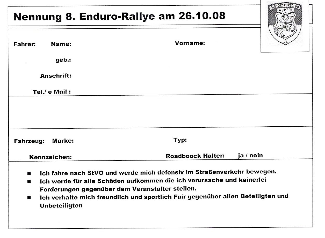 Nennungen können per Fax: 03425/ 81 04 75 oder auch per Email an mc-wurzen@gmx.de Betreff Enduro-Rallye, gesendet werden.