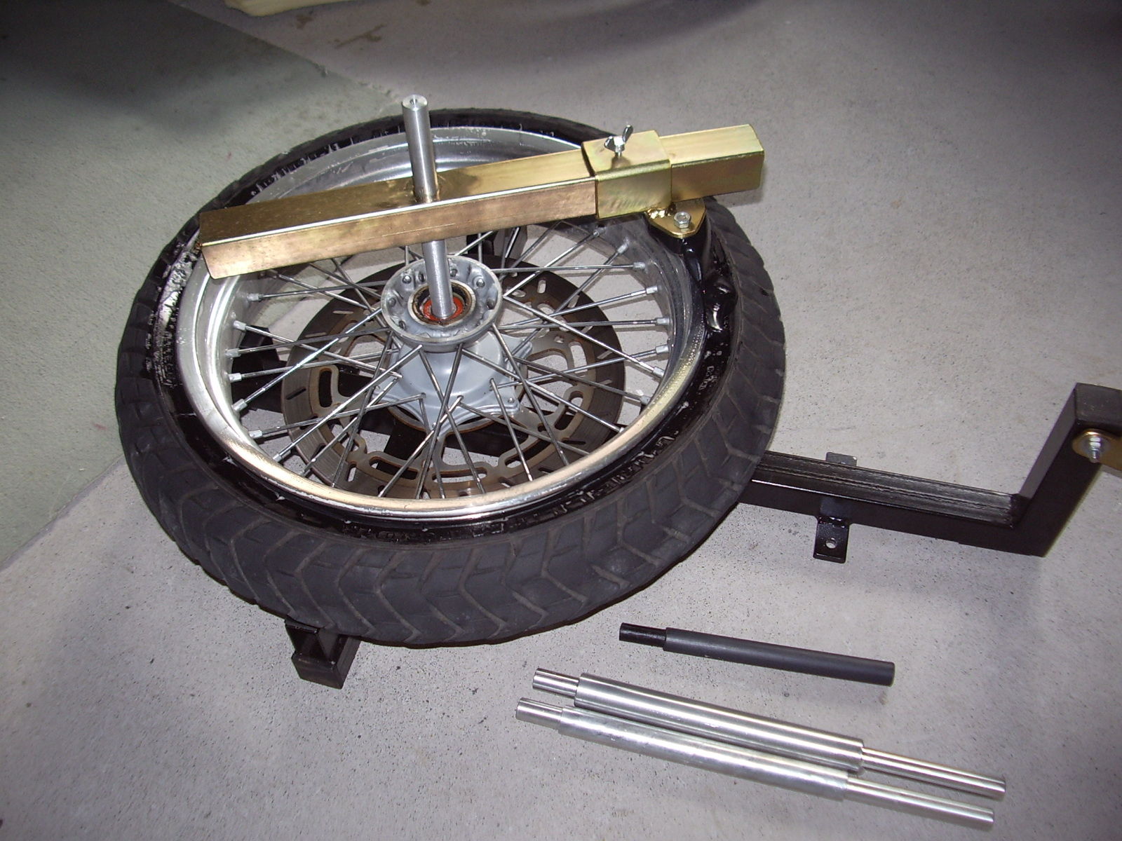 Das Montiergerät ist aus lackiertem (schwarz) bzw. verzinktem Stahl, die Felgenauflagen und Füsse sind gummiert (keine verkratzten Felgen). Achswellen sind aus Alu