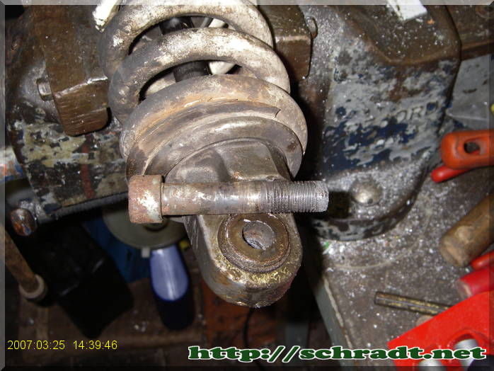 Die Schraube war an den Buchsen des Federbeins festgegammelt, es half leider auch kein Caramba Rasant mehr. Das Gewinde in der Schwinge drehte einfach durch. |