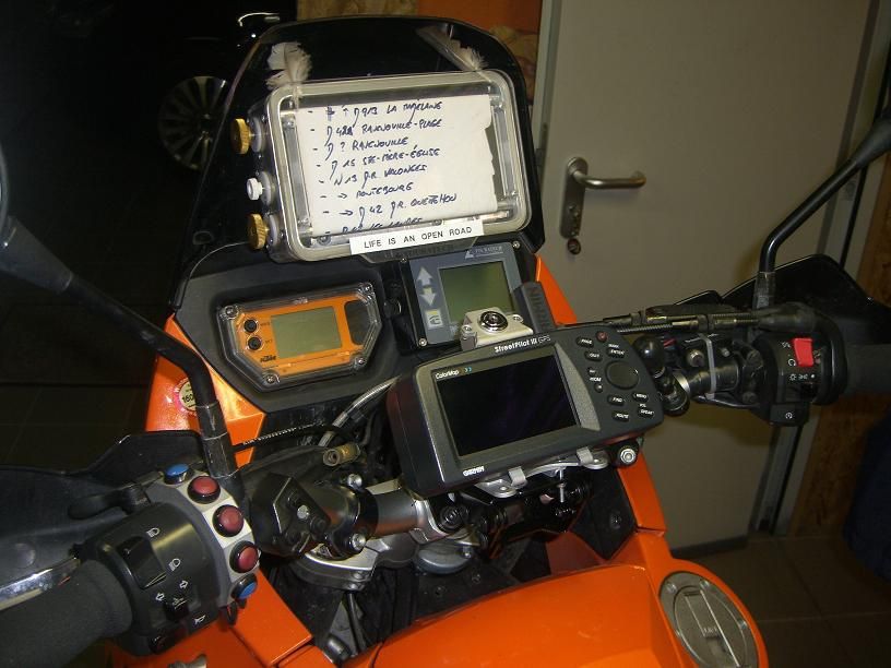 Jetzt zum Thema. Hier hatte mal jemand eine Navi/Roadbookhalterung, welche aussen an der Verkeidung verschraubt wurde, über die Verkleidungsschrauben. Richtig masive Eisen links und rechts und einen Bügel übers Cockpit. Sah so stabiel aus als ob man da zur Not auch ein Chemieklo dranschrauben könnte. Das muß an der Neuen auch passen. Ich finde den Fred leider nicht. War ein großes Bild mit bei. Es ging in dem Fred allgemein um Navihalterungen. Must Du mal