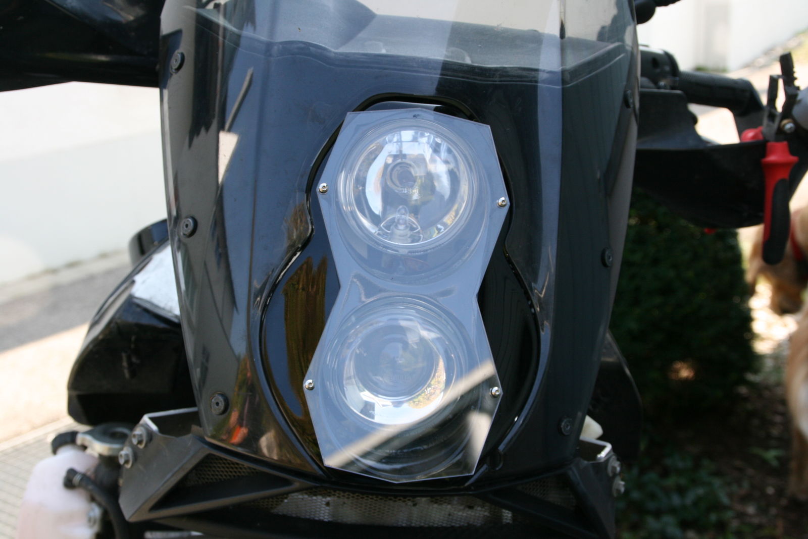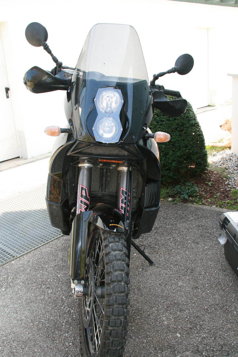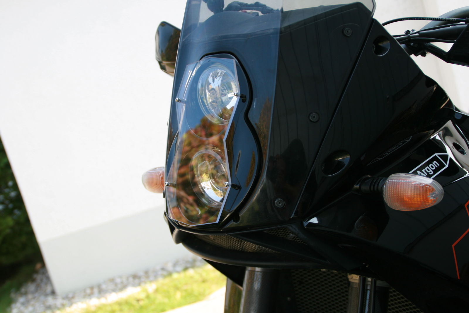 Hallo, als erstes meine dank an KTM Bastler, der das geniale Teil gebastelt hat. Ich hatte den "Sonderwunsch", das die Front, der der 690er Megasystem ähneln soll. Hierzu mußte der kleine Schnabel natürlich weg, damit der Scheinwerferschutz passt und die Scheinwerfer dann mit der Maske bündig sind. Und so schauts aus.