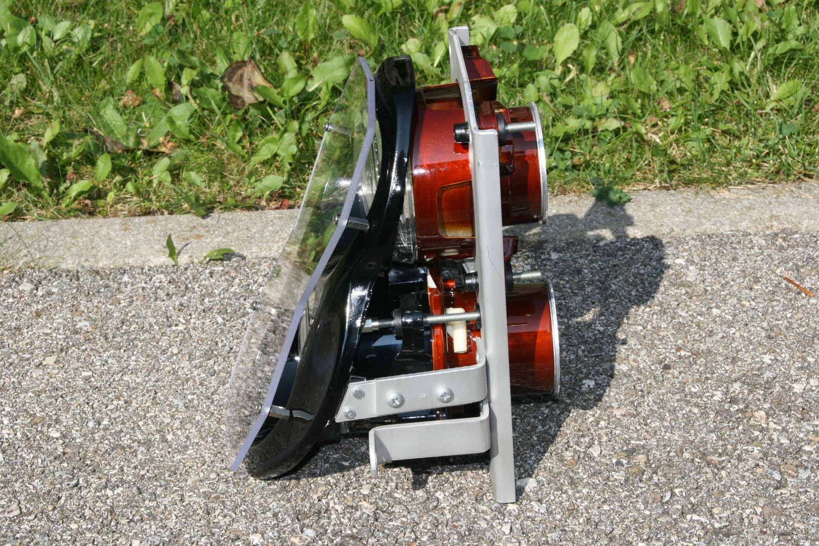 Da ich die Optik von der Megasystem wollte, find ich die eckige form gerade gut. Aber das gute ander Konstruktion ( hier nochmal danke an ktmbastler ) ist, andere makrolonscheib ausgesägt. 4 Löcher und drauf damit. Ein Nachteil hat die Sache allerdings. Um die Scheinwerfer einzustellen, muß man ein bisschen schrauben, da die scwarze Blende seitlich verschraubt ist, also ab mit den Backen. Aber wie oft stellt man die Dinger ein.