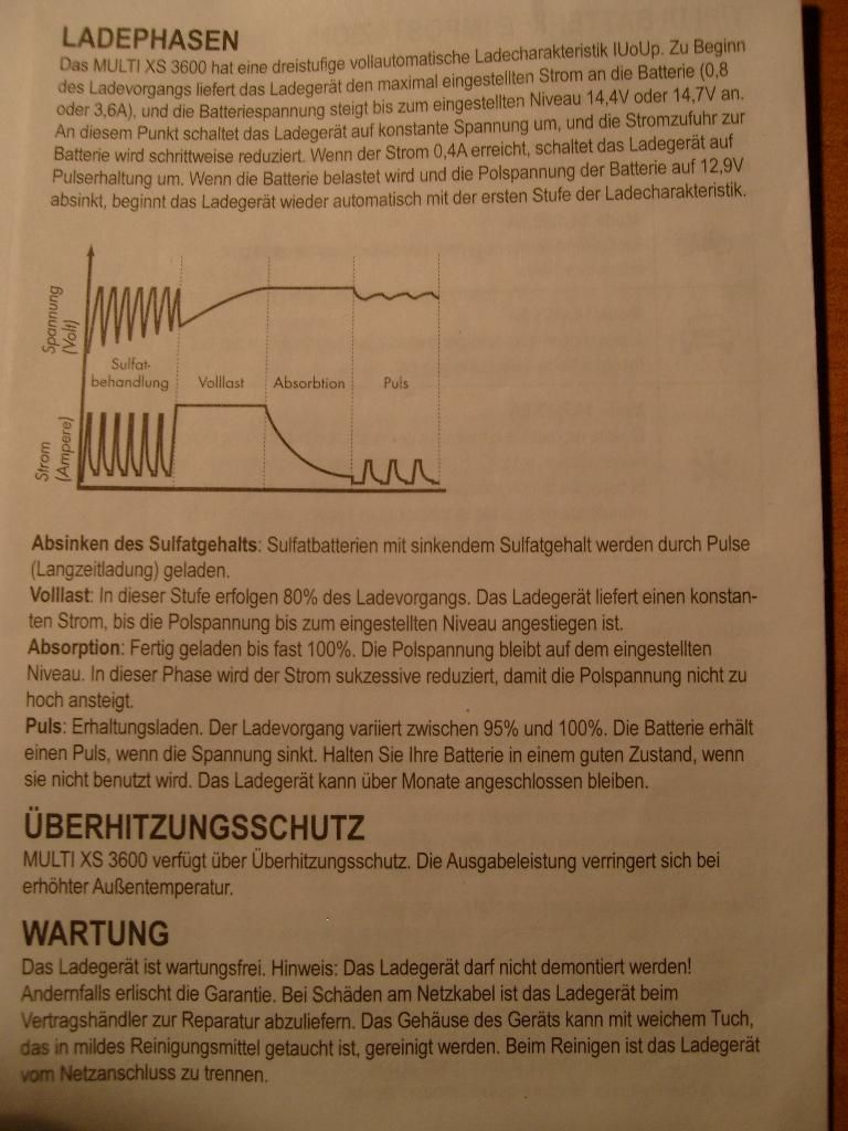 Es gibt dann Ladeprogramme mit pulsierenden Spannungen. Stark pulsierend für den Versuch, evtl. vorhandene Sulfatierung rückgängig zu machen. Schwach pulsierend fürs Dauerladen (s. Foto der Anleitung). Desweiteren sind Ladegeräte nicht beliebig stark (unterschiedliche Maximalströme).