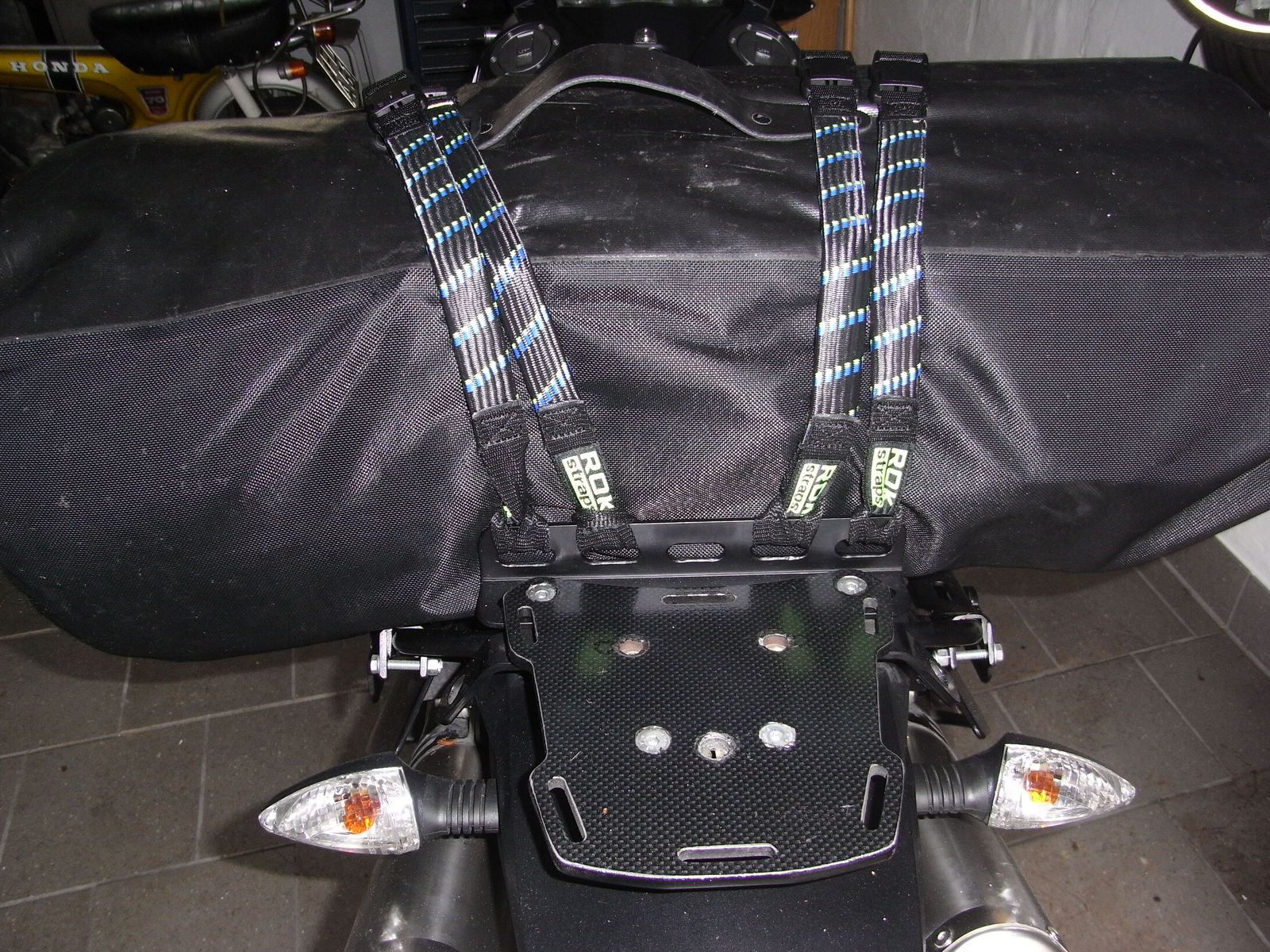 Meine variante hat zwar nichts mit "sichern" im Sinne gegen Diebstahl zu tun sondern mit befestigen.Da ich meistens nur mit Gepäckrollen und das nicht bei jedem beliebten "Topfkäs" unterwegs bin,hab ich mir eine Möglichkeit zum befestigen und verzurren der Rollen gebaut.In Verbindung mit den Rockstraps hat man diese Ruckzuck an bzw. abgerödelt.