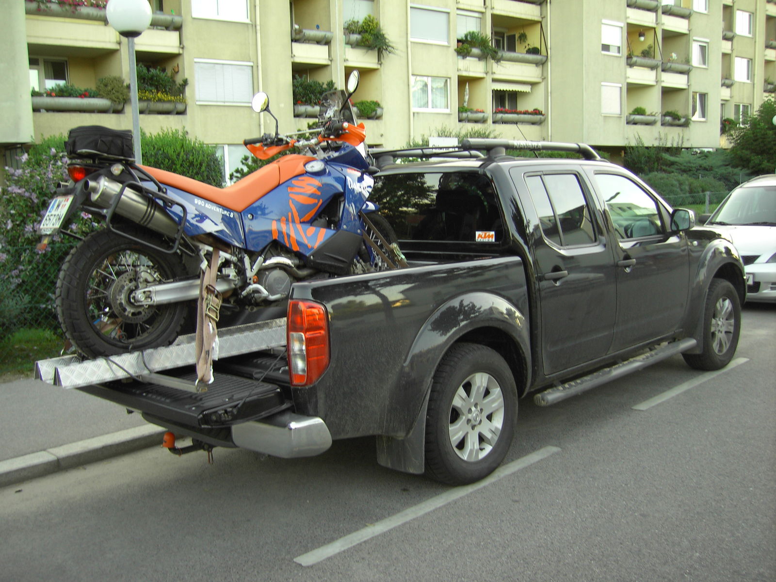 Beim Doppelkabiner steht das Hinterrad genau auf der Klappenkante! Aber Abhilfe schafft ein Riffelblech unter und das Mopped auf den Zentralständer gestellt.