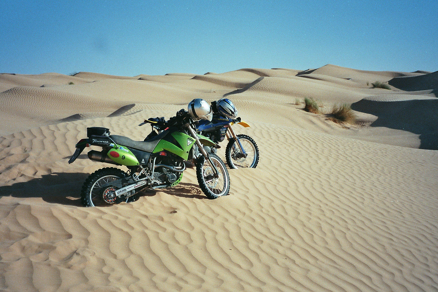 Das zweite, was mit erst schwerfiel, ist über 1-2 m hohe Dünen in einen nichteinsehbaren Bereich mit Vollgas drüberzubügeln oder gar zu springen. Das kann 10x gutgehen und beim 11x ist dahinter ein Kamelgrashügel, und schon liegt man oder noch schlimmer plötzlich riesige scharfe Steine oder ein Trichterloch, wo man ohne fremde Hilfe nich mehr rauskommt. Die Wüste ist immer für Überraschungen gut. Am Dünenkamm anzuhalten geht zwar, aber das muß punktgenau sitzen, weil der letzte Meter, wo der Sand angeweht wird, weich ist, wie Pulverschnee. Vorderrad nach unten, sonst kommt man nicht mehr los.