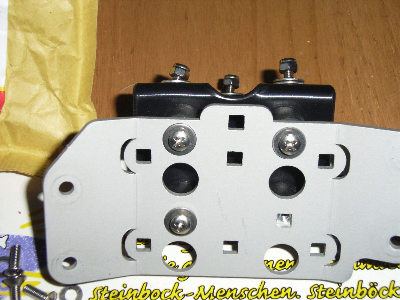 Zum Zusammenbau habe ich den Touratechhalter an den Gummipuffern demontiert. Der Touratechhalter passt mit den Löchern für die Ram-mount Halterung auf den Bikertechhalter.