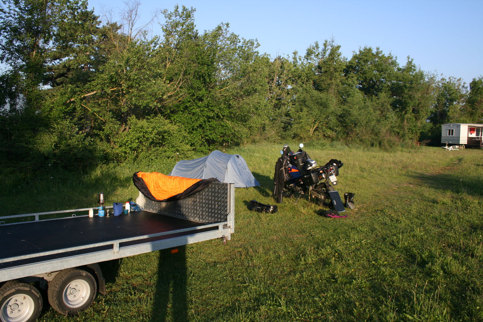 Zeltplatz in Fombeton, richtig nett wäre ein Hinweis auf die Pferde Weide, ohne Zelt Unterlage müsste ein Neues her . . .