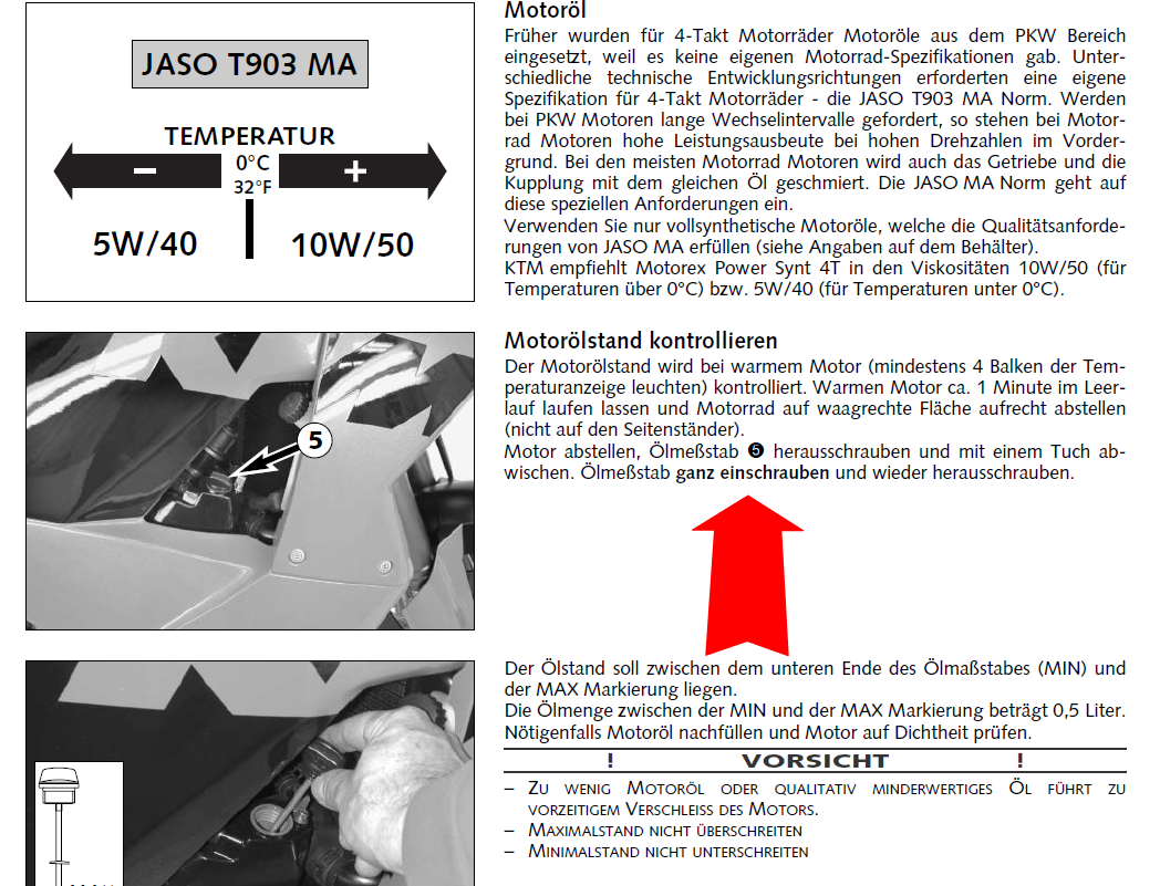 Hab auch meine Probleme mit genauer Ölstandsmessung. Bei BMW sieht man das am Schauglas, finde ich gut. Aber nun ja, is halt so bei KTM, was auch kein Problem darstellen soll.