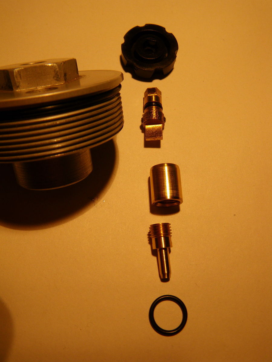 Du musst das Plasterädchen entfernen. Anschließend den größeren O-Ring unten aus dem Alugehäuse friemeln. Dann im Schraubstock den 6-Kant nach innen drücken und mit einem geeigneten Dorn durchtreiben. Vorsichtig, Messing ist weich! Dann haste die Messinginnereien in der Hand und kannst die O-Ringe wechseln. Die Kugelrastung kannste einfach rausfummeln und frisch fetten. Sind zwei Kugeln mit einer Feder dazwischen. Beim Zusammenbau dann alles gut mit Siliconfett einsetzen...