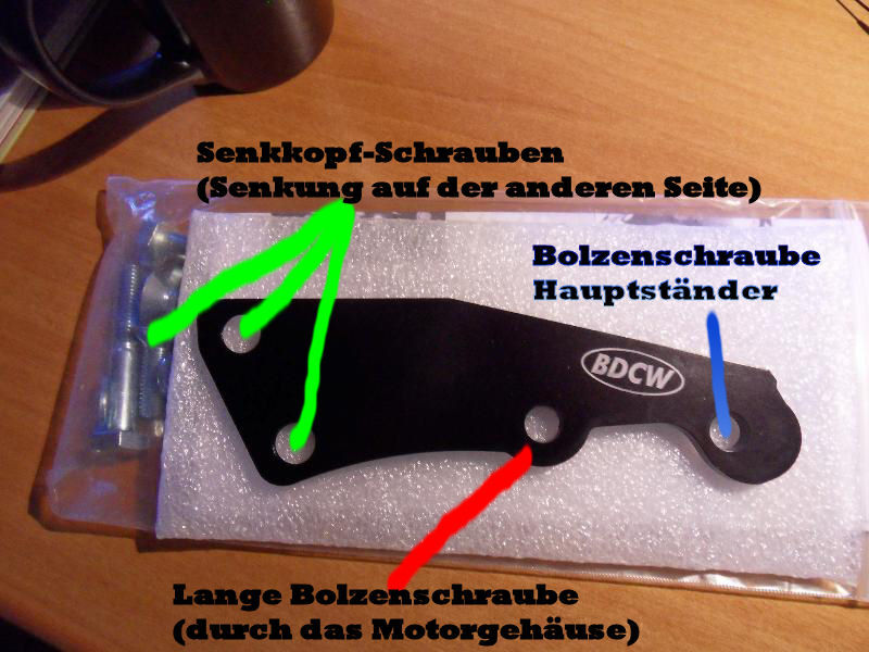 Der Blackdock (und damit der drauf angeschraubte Seitenständer) hat an den vorderen Schrauben (Senkkopf in den Körper des BD) keine Verbindung mehr zum Motor-Gehäuse. Ist "nur" noch durch eine megalange, fette Bolzenschraube durch die gesamte Breite des Motorgehäuses und direkt an der linken Hauptständer-Befestigung mit einer Bolzenschraube mit dem Bike verbunden, das aber genauso stabil wie vorher, so wie ich das mal subjektiv beurteilen kann. Also.......schaun ma mal!