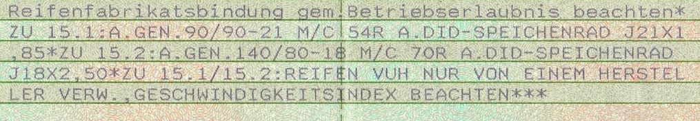 ww mit Geländereifen vo 90/90R21 54R und hi 140/80R18 70R, dan zul. Geschwindigkeit beachten, Geschw.hinweis am Fahrzeug erf.;;