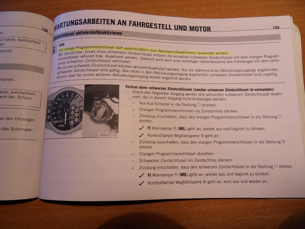 Mei Händler hat mich mehrmas darauf hingewiesen ihn NIEMALS in Zündschlß zu stecken und zu benutzen! Da wird dann irgenwie alles gelöcht>ist scheinbar nur für den Händler bei irgendwelche Problemen gedacht...(Der Orangene Schlüssel!)