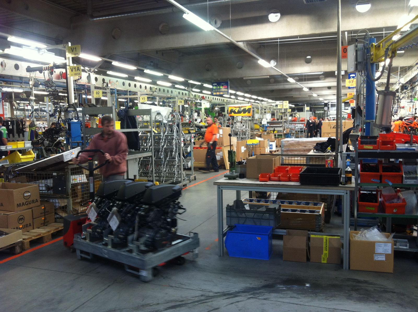 Jeder Motor lauft auf dem Prüfstand und muss eine Mindestleistung bringen,wenn nicht geht er zurück, nach dem Prüfstandslauf gibt´s bereits den ersten Ölwechsel mit Filter.Also hat jede KTM bei der Auslieferung die erste Einfahrphase hinter sich.schade das wir in den Hallen nicht forografieren durften.