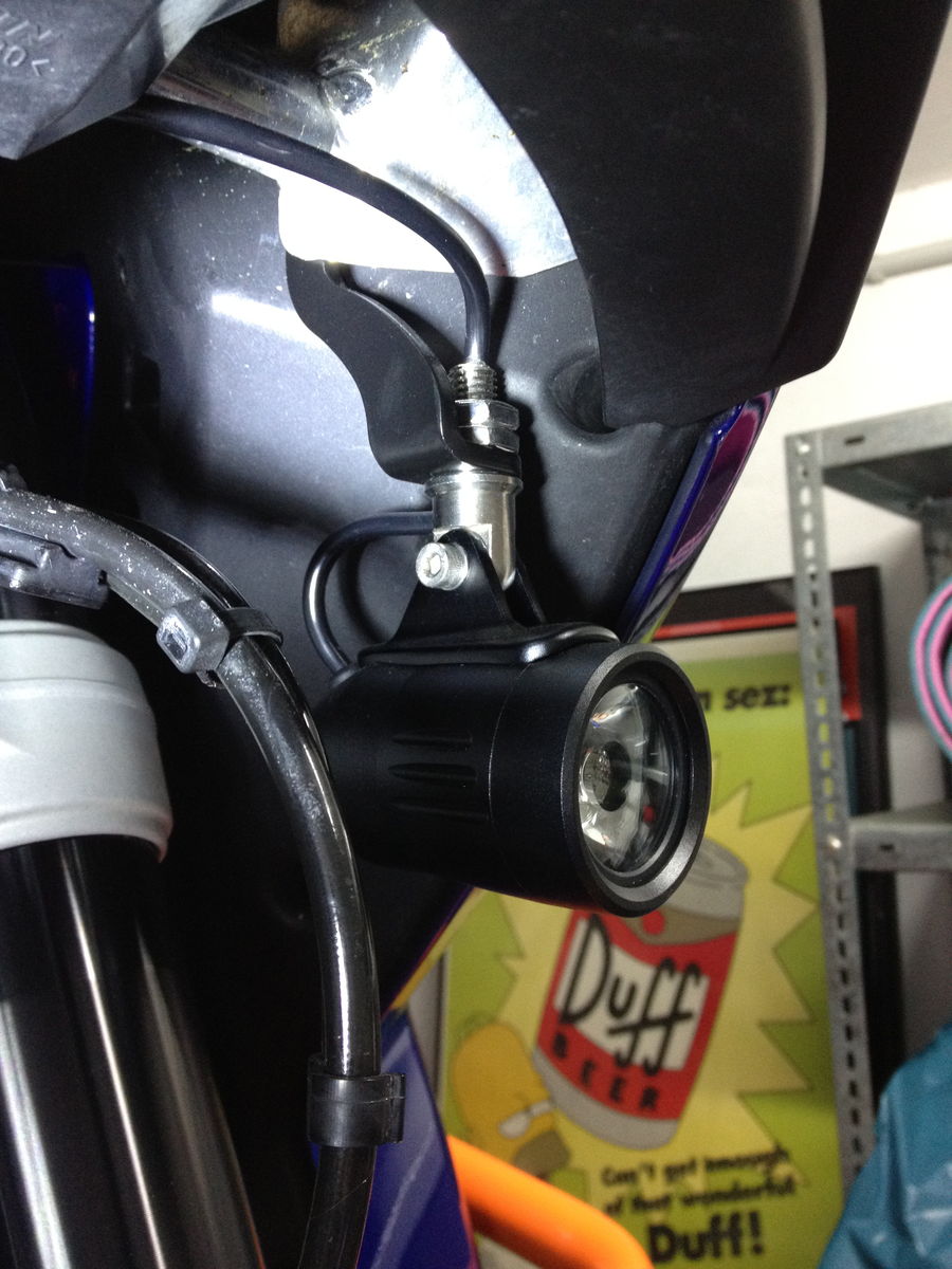 Der Anbau lässt sich in 30 Minuten erledigen (Hamsterbacken und Scheinwerfer raus). Die Besonderheit bei den Dingern: An der Rückseite der Scheinwerfer ist ein blauer Gummiknopf. Mit diesem lässt sich die LED-Funzel in drei Stärken dimmen oder ganz abschalten (zum TÜV???). Der neue Schlater am Lenker bietet drei Schaltstufen: