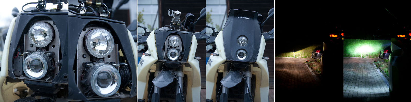 Ich habe die selben Lampen an meiner BMW XChallenge verbaut. Das Fahrwerk hat lange Federweg und mit Luftfederbein ist es wie ein Schaukelpferd. Nach dem Umbau voller Freude ausprobiert. Ja die Dinger brennen richtig Löcher in die Nacht da ist man gleich schnell wie am Tag unterwegs. Auf der Hausstrecke um Mitternacht und bei Vollmond in den Wald und in eine Rechtskurve eingebremst und es war auf einen Schlag absolut finster. Mondlicht weg und Moppedlicht auch aus, beziehungsweise 2 Meter vor dem Vorderrad wars gleissen hell. Mit Herzstillstand bis zum Stehen gebremst. Moped kommt aus dem Federn und es wird wieder hell. Ich stehe noch auf der Strasse aber einen Meter vor einem Baum, den hätte ich mittig getroffen.