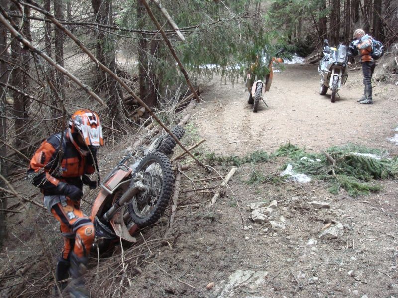 Bei meinem heutigen Offroadausflug ist mir die Maschine sage und schreibe 4 mal in den Dreck gefallen. Das Aufrichten der Maschine ist immer ein halber Gewaltakt gewesen. Dabei bin ich mit 1,86 nicht gerade schmächtig. Teils lag die Maschine auch halb hangabwärts, so das ich nicht nur 90 Grad, sondern noch mehr hochheben musste. Fakt ist eines: Dass ist kein wirklicher Spass. Beim Hochheben habe ich mich immer gefragt, wo ich denn anfassen soll. An der Sitzbank hab ich keinen Halt gefunden. Ich hab dann am Lenker angefasst. Richtig wohl war mir dabei nicht, aber erstens hätte ich sie sonst gar nicht hochbekommen und zweitens habe ich noch nicht festgestellt, dass der Lenker durch solche Aktionen Schaden nimmt. Aber gut kann dass nicht sein, wenn man da am Lenkeranschlag das ganze Geweicht der Maschine hochhebt. Wie hebt Ihre Eure Maschinen eigentlich auf, wenn ihr allein seid? Auch am Lenker?