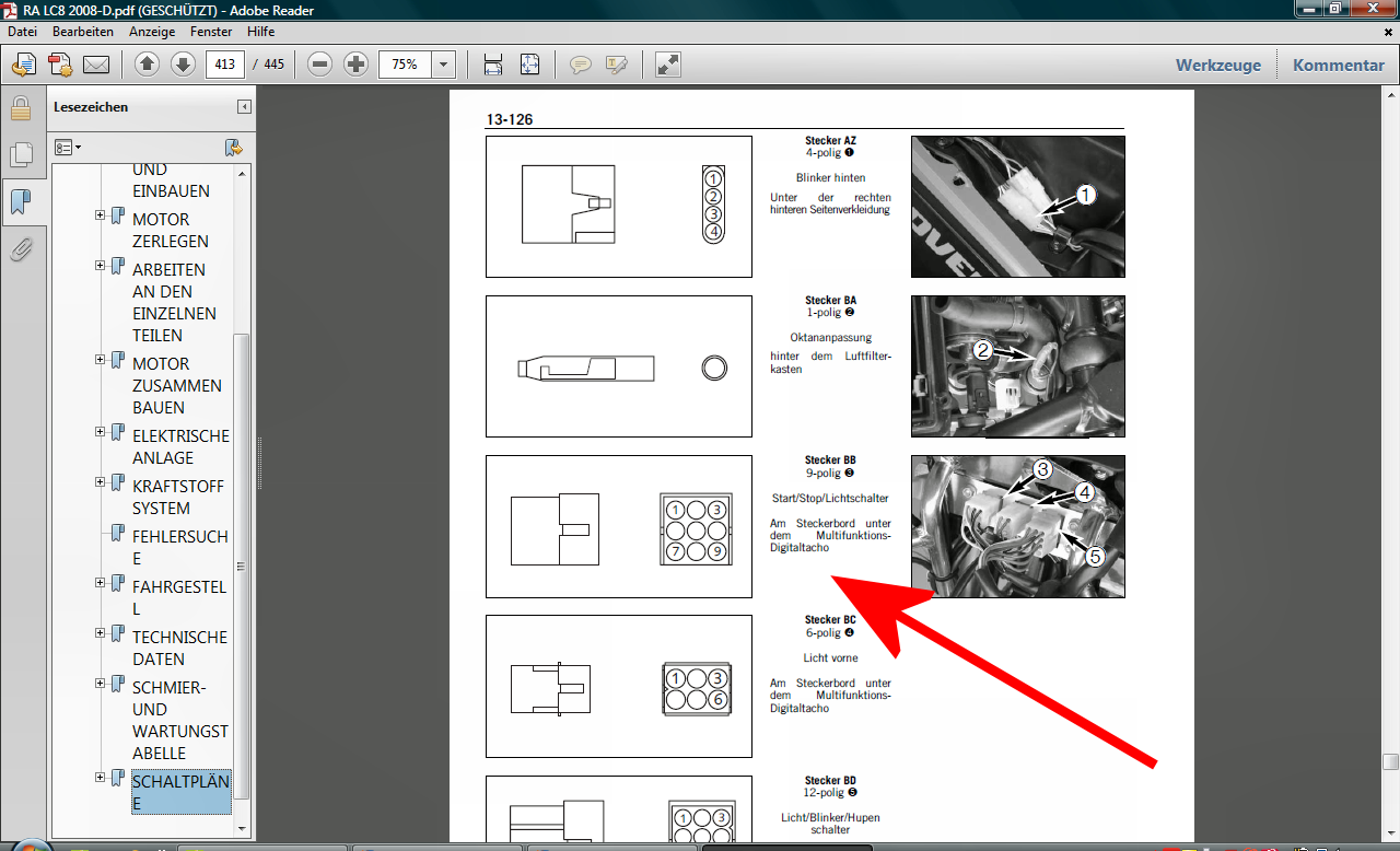 Schwierig von hier aus.... Sad ! Also, ich kann Dir noch den Schaltplan anbieten, von der 990iger ...bis 2007er Baujahr. Also nicht den ab 2007, denn den hab ich bereits hochgeladen. Dieser ummantelte Knick, alle 6 Kabel, direkt am Zündschloß...... wenn Du die bewegst, mit eingeschaltener Zündung....iss ein Unterschied zu bemerken? Oder was Du auch noch machen könntest.....an allen 6 Kabeln vorsichtig zu ziehen, in beiden Richtungen....vielleicht ist eines dabei, bei der die Isolierung länger und länger wird, oder ganz abreißt. unsure