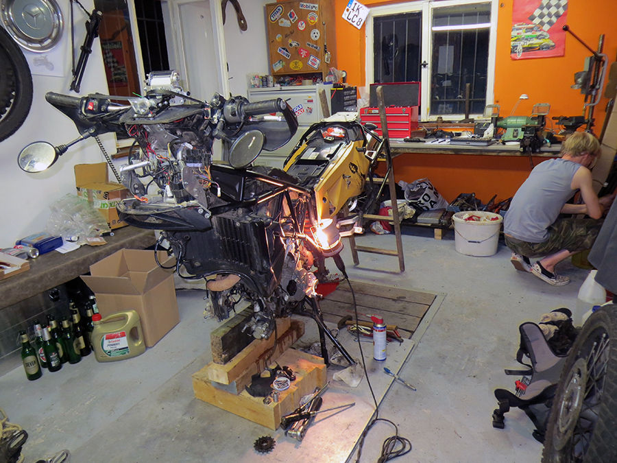 die letzen beiden Wochen habe ich an meinem Mopped geschraubt, es hatte sich einiges angesammelt zudem habe ich den 45000er Service gemacht. Sie ist zwar noch gefahren, aber mehr schlecht als recht. Sie hatte eigentlich alle Arten von Inkontinenz: Kühlwasserverlust nach Motor, an einer alten Baustelle der Ölleitung kam Öl, die HR Bremse verlor ab und an etwas Bremsflüssigkeit, und neulich hat sie auch noch etwas Benzin gelassen aufgrund eines spröden Schlauches. Außerdem war das LKL hin und die Gabel hatte vor längerem mal etwas geölt, und die Gabel ist außerdem ohne Belastung schon stark eingesunken (war aber erst im WInter 11/12 bei Dietrich)..