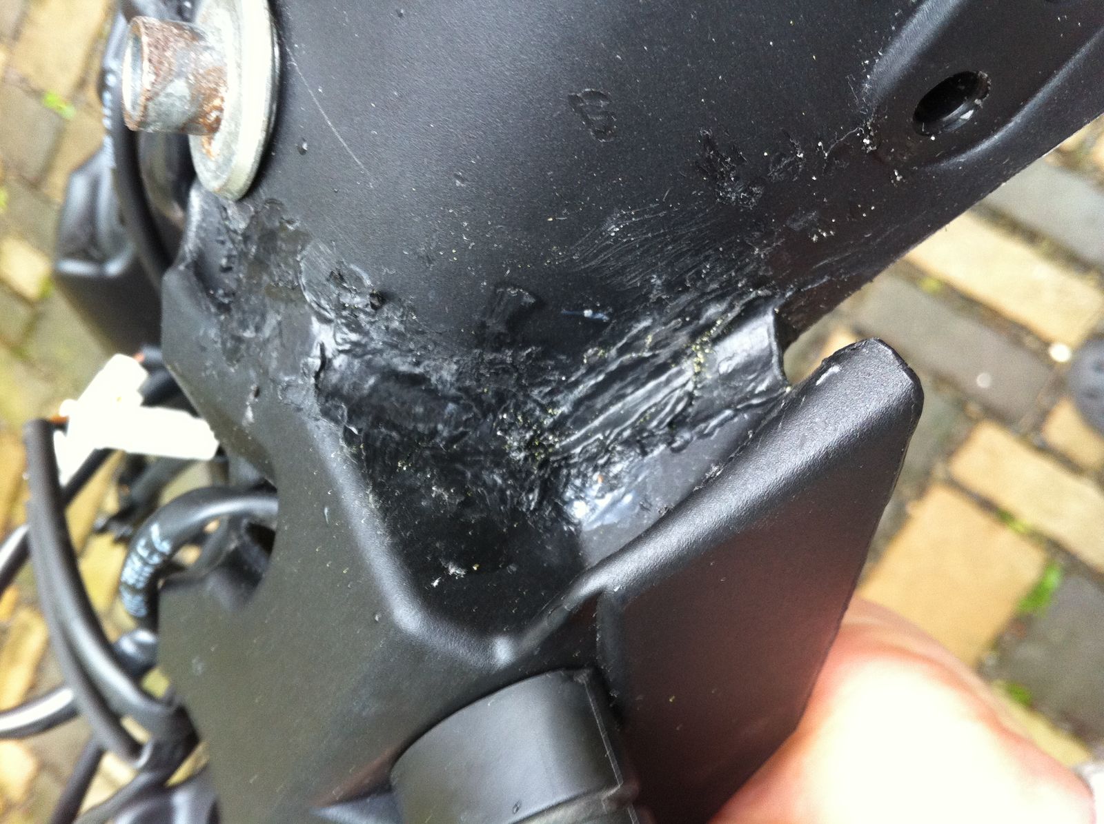 Dann sägt man den Racetech auf die richtige LÄnge ab, sägt den originalen neuen ab. passt beide zusammen an. Reisst die großen Löcher obendrauf an wo diese Aluhülsen reinkommen zur Befestigung. Wenn das alles sitzt, passt und gerade ist....Lötkolben frei und die beiden Plastikteile zu einem verschweissen rundrum...zum Füllen der Nähte kann man Streifen der Plastikreste verwenden und als Füllmaterial mit reinschmelzen. :-)