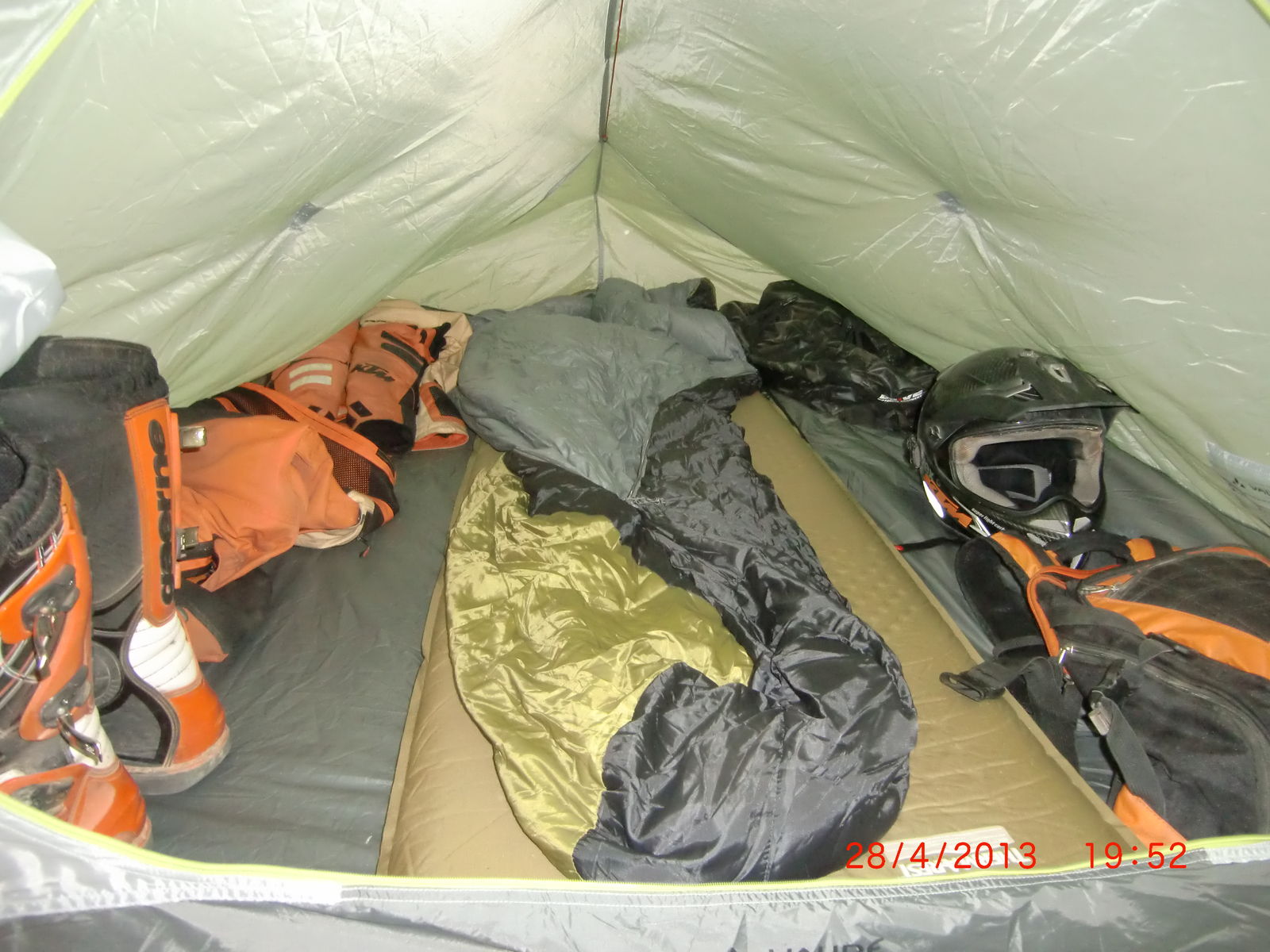 Für ein 2 Mann Zelt 4200 gramm sind wirklich viel. Das liegt auch am Fiberglasgestänge. Und mit Mopedklamotten passt wirklich nur einer rein. Die Helm, Stiefel, Jacke und Hose können schließlich nicht vor dem Zelt bleiben.