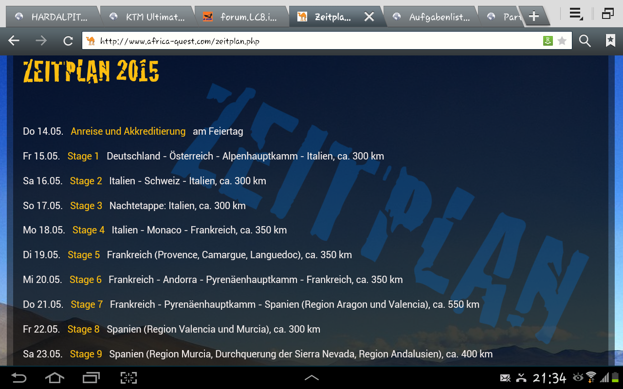 Start 14.5 (Vatertag) in München und ab 15 gehts los incl .einer Nachtetappe dann 14 Tage später in marrokko und 5 tage zurück oder moped per spedition 600 und mensch flug zurück ....sprit sind ja auch min 250 pro lc8 und spesen ...