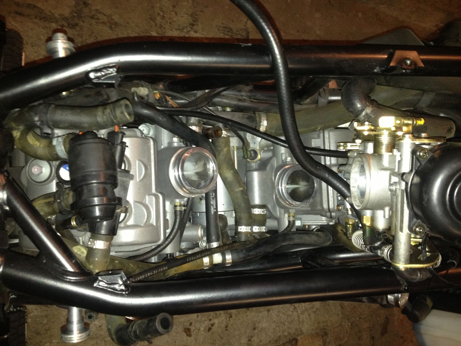 Nachdem ich eben mal die Tanks runtergenommen habe, habe ich gesehen, dass genau darüber aus der Airbox zwei Schläuche herausragen.
