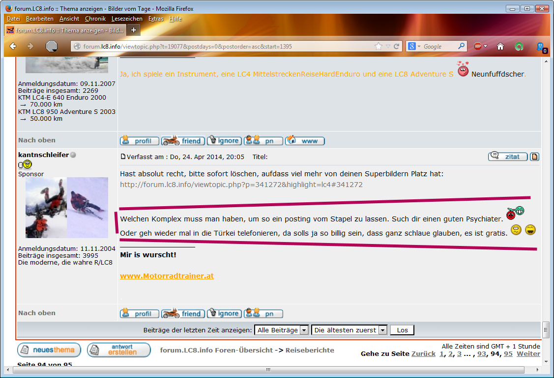 Und schon wieder werde ich auf das Übelste beschimpft. Siehst du IchundDu, das habe ich vorher gemeint. Auch wenn man es nicht sehen will, hier gibts wohl auch mit der großzügigsten Auslegung für keinen mehr einen Zweifel. Wie lange muss ich mir das noch gefallen lassen?
