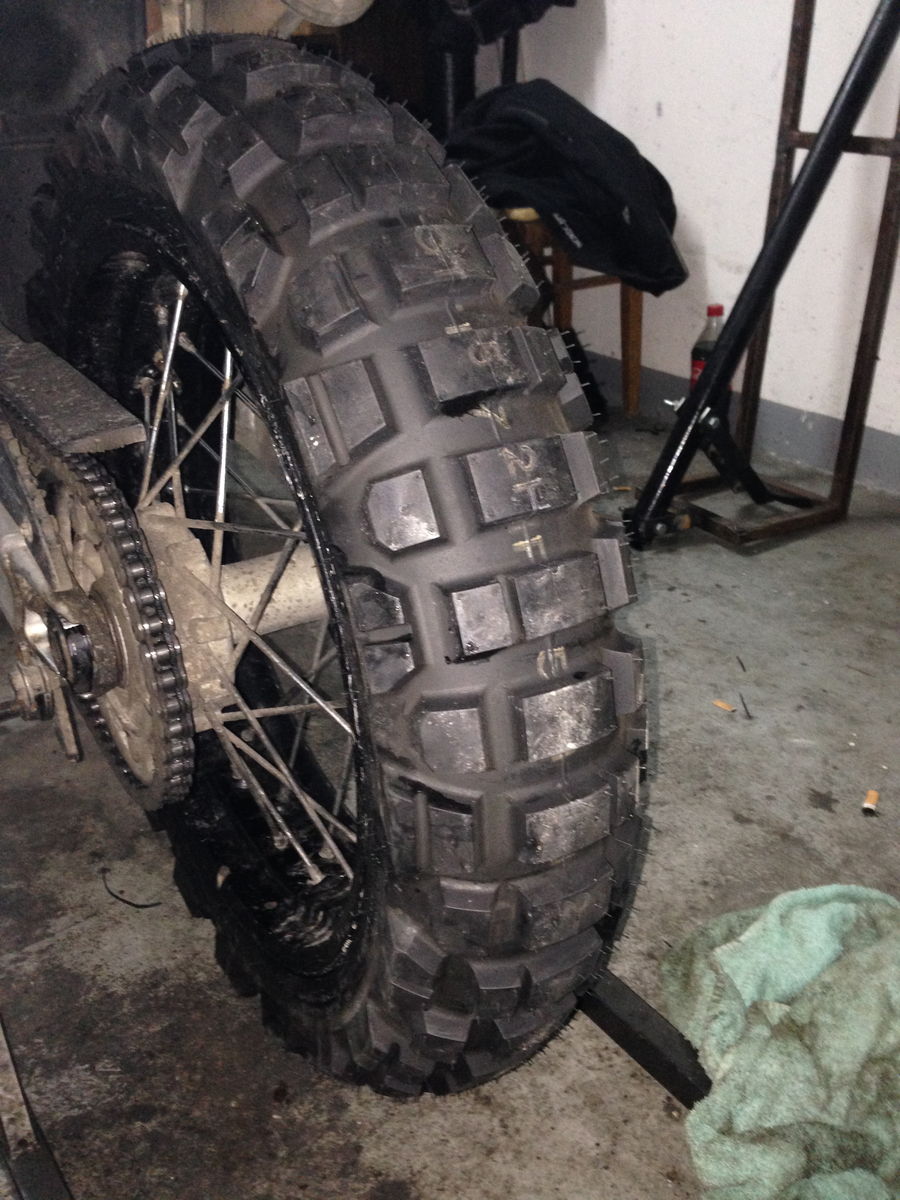einen Reifenhalter für 4,0-Zoll-Felgen? Das Breiteste, was ich kenne, sind 2,5 Zoll. Überleg´ auch mal, was Du da an Wuchtgewichten bräuchtest! Die Hinterradfelge der ADV hat einen Doppel-Hump (H2), das hält den Reifenwulst eigentlich schon gut am Felgenrand, auch bei z.B. 2,0 bar Reifenfülldruck und gut beladen. Ansonsten: 2,5-Zoll-Felge einspeichen, die paßt dann auch wesentlich besser zu einem 140er Reifen für die Piste.