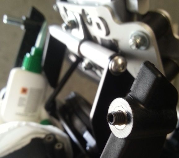 In der Zwischenzeit habe ich zwei Inbusschrauben mit selbstgemachten Distanzhülsen (8mm Alurohr, ca. 3mm abgeschnitten, damit die Schrauben nicht zuviel Druck auf die Scheibe ausüben) sowie die halbierte Verlängerungsmutter verwendet. Man braucht jetzt halt noch einen Inbusschlüssel und das demontieren ist ein kleines bisschen komplizierter... Aber das ist ja nur die Übergangslösung. Im letzten Bild ist die Schraube übrigends noch nicht festgezogen..