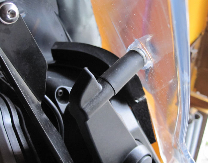 Jetzt kann ich, je nach Helm bis ca. 60 km/h ohne MX-Brille bzw. mit offenen Visier fahren. Zudem verschwindet das GPS durch die Halterung von Roland von endlich "hinter" der Scheibe".