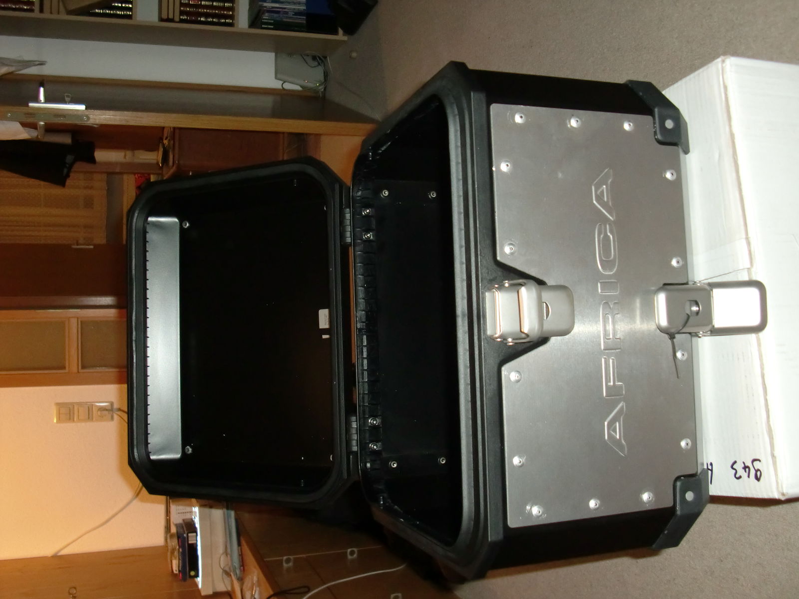 An der Innenseite des Topcase ist spiegelbildlich er Schriftzug eines Motorradherstellers zu sehen, der zuvor hinter der "Africa-" Platte eingestanzt war. Dies hat jedoch keine Auswirkung auf das Volumen des Topcase.