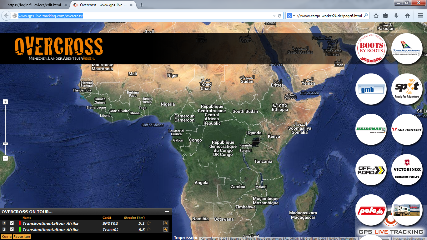 Am 26.12.14 statet die Expedition und ab dem 1.1.15 müssten wir auf der Eventseite von OC sateliten Empfang haben. Ab da könnt ihr "life" die Tour durch Afrika verfolgen. http://www.gps-live-tracking.com/overcross.