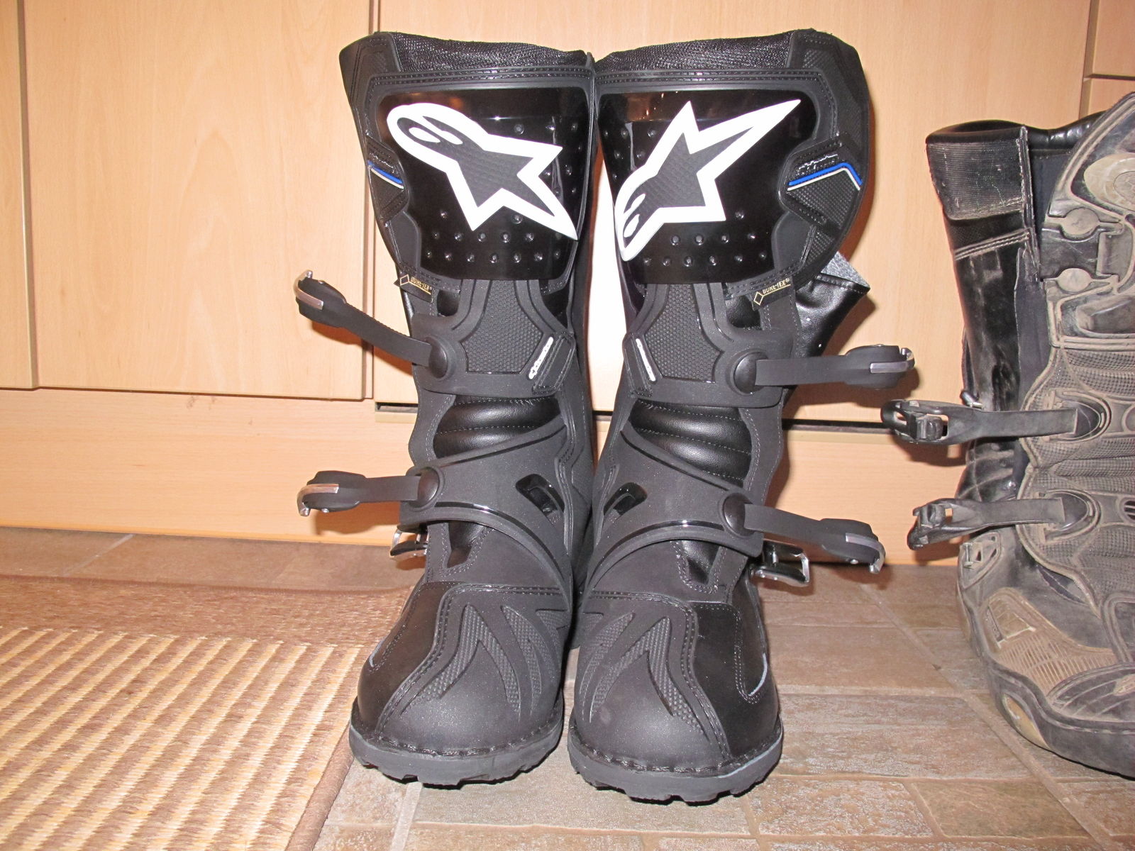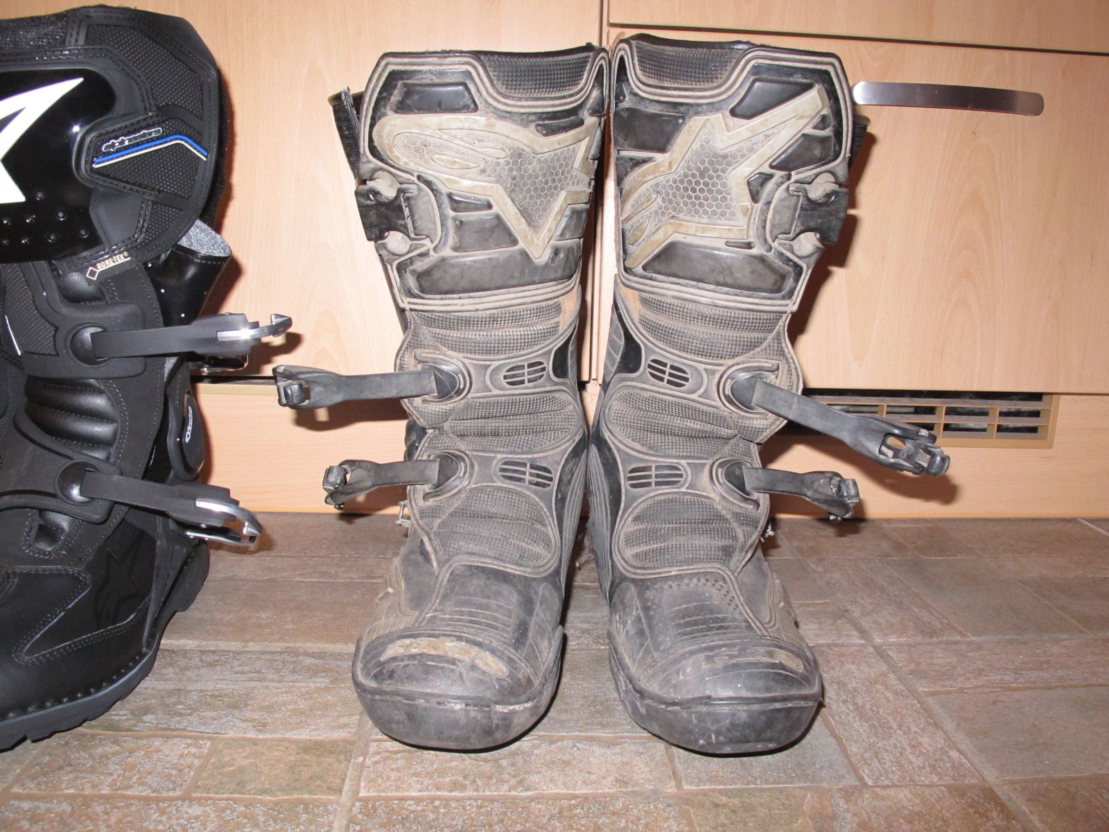 Zwischendurch hatte ich mal ein Paar TCX Infinity gekauft, die wegen der kuschelweichen Sohle jeden Zacken der Fußrasten spürbar werden lassen und deswegen nur in der Ecke stehen. Außerdem hab ich mir mit den Stahlkappen mehrere Moppeds zerkratzt.