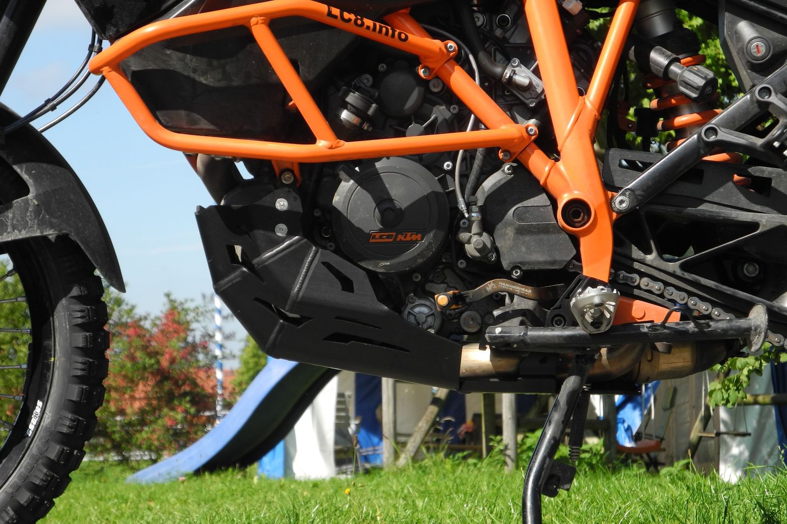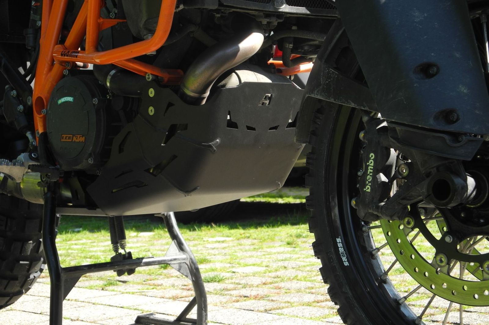 Bei Altrider wurde die Besonderheit den Modellen ab Bj. 2014 beachtet, bei denen das Gewinde unten rechts an der Motoraufhängung fehlt. Während bei den 2013er Modellen mit dem besagten Gewinde wieder eine Schraube verwendet wird, wird bei den 2014er Modellen anstelle einer Schraube wird dort nun in die vorhandene Bohrung eine Art „Stift“ eingesetzt und es muss daher keine Gewinde geschnitten werden. Daher unbedingt das Modelljahr 2013 oder 2014 bei der Bestellung angeben. Der Motorschutz kann mit und ohne den KTM Sturzbügel verwendet werden, da entsprechende Distanzbuchsen beiliegen. Der Preis ist aber immer gleich, egal ob 13er oder 14er Modell oder ob silber oder schwarz.