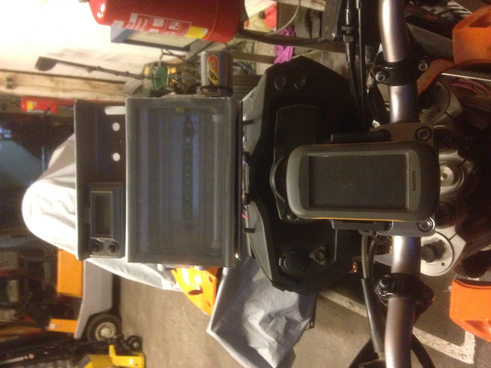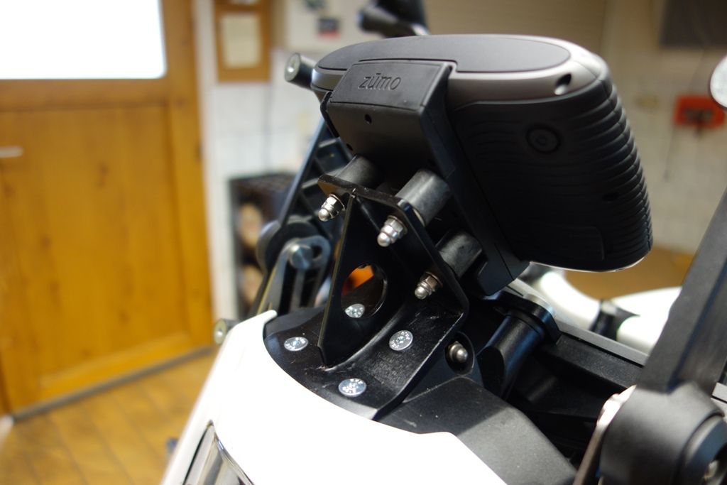 Ich habe eine der beiden oberen Schrauben der Cockpitverkleidung durch einen Ram-Mount-Kugelkopf ersetzt und da die Garmin-Halterung mit Stromversorgung dran.