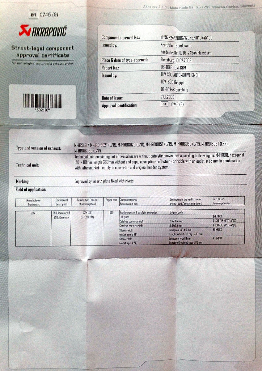 die auf Deine 990ADV aus 2009 passende Akrapovic-Anlage in legaler Version hat die KTM-Teilenummer 601.05.099.100. Siehe im Anhang Bild links. Die Anlage ist nur legal mit je einem Kat-Einsatz im Adapterflansch zwischen Serienkrümmer und Endschalldämpfer. Diese Kats werden einfach von hinten her in den Flansch eingeschoben. Im Zweifel solltest Du die Schalldämpfer ziehen und kontrollieren, ob Du die Kats auch hast. Zu Deiner e-Nummer: ich habe hier leider keine Homologationsbescheinigung mehr, aber die genannte e1 0745(9) ist meiner Erinnerung nach die richtige für die 990ADV. Wäre nett, wenn jemand aus dem Forum das bestätigen oder korrigieren könnte, danke. Bei e-Kennzeichnung auf beiden Schalldämpfern brauchst Du eigentlich keine Homologationspapiere vorzuweisen. Aber vielleicht bekommst Du ja noch vom Verkäufer die passenden Originale oder hier im Forum wenigstens eine Kopie - für alle Fälle.